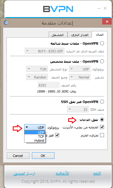 إن خدمة b.VPN تقدم 4 خيارات لبروتوكول تشفير اتصال OpenVPN وهي: UDP, TCP, SSH بالإضافة إلى النفق المطور SMOKE. وكجزء من عملية فرض الرقابة على الإنترنت، تقوم بعض الشبكات في بعض المناطق بتقليل متعمد لسرعة الاتصال عبر نفق تشفير معين. ولذا فمن الأفضل تجربة كافة الخيارات لتحديد الخيار المناسب. عملية تغيير بروتوكولات التشفير عملية سهلة ويمكن تفعيلها بضغطة زر.