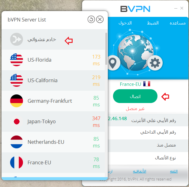 ستجد بجوار كل خادم رقم يشير إلى معدل استجابة Ping وكلما كان هذا الرقم أقل، كلما كان الخادم أسرع. كما يمكنك اختيار "خادم عشوائي" ليقوم التطبيق تلقائيا باختيار الخادم الأسرع بالنسبة لك.