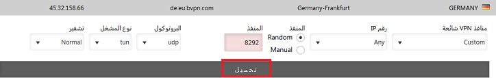 في حقل Server IP/Name أدخل عنوان الخادم والذي يمكنك أن تجده في ملف الضبط الذي قمت بتحميله. على سبيل المثال، إذا كنت قد قمت بتحميل ملف ضبط خادم Germany-Frankfurt فسيكون عنوان الخادم هو de.eu.bvpn.com