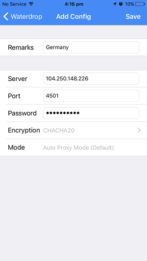 Add server credentials, copy/ paste the password, choose CHACHA20 for encryption then tap “Save”.