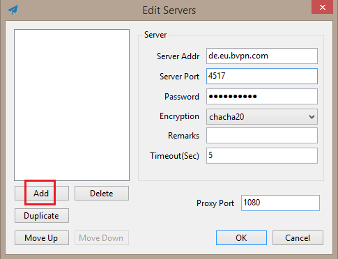 Click “Add” then insert the Server Addr, Server Port and Password. For “Encryption”, select “chacha20”. Click “OK”.