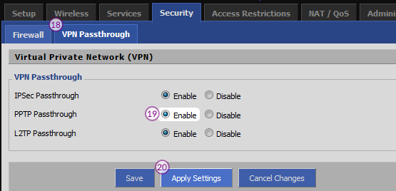 Go to “VPN Passthrough” tab and select “Enable” for “PPTP Passthrough” then click on “Apply settings”.