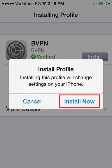 You will have to confirm the installation of the VPN Profile by providing your 4-digit passcode then tap “Install Now”.
