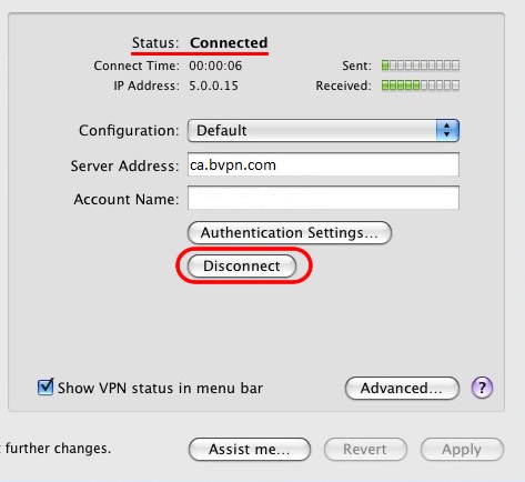 Click “Apply”, then click the VPN icon in the menu bar and then click on “Connect” button.